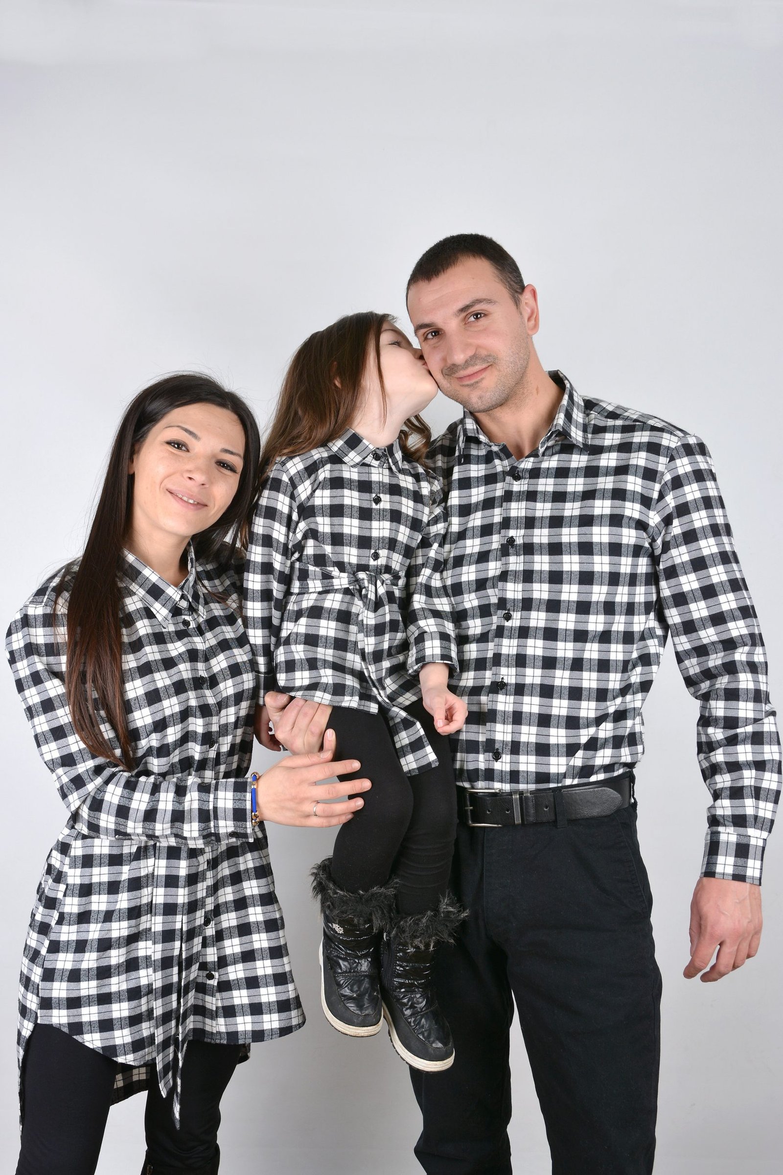 Класически карирани ризи в черно-бяло, подходящи за цялото семейство. Моделът се предлага като ризи-туники за майка и дъщеря, както и ризи за баща и син, което позволява лесно комбиниране в семеен стил.