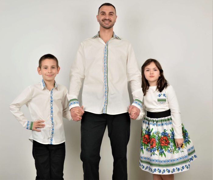 Ризите са изработени в класическа кройка, подходяща за ежедневно носене, училище, семейни събития и празнични поводи. Белият основен цвят подчертава декоративната шевица, вдъхновена от шопския регион, като създава чиста и балансирана визия за деца и възрастни.